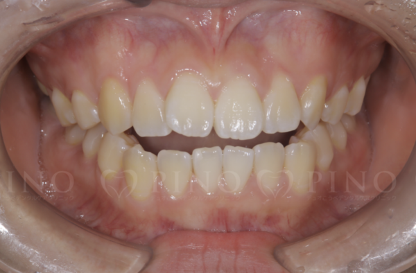 正しい噛み合わせでは、下の歯に上の歯が1〜3mm程度重なるのが通常ですが、ディープバイトの方は上の歯が下の歯を覆ってしまいほとんど見えません。
