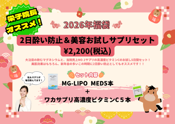 大注目の飲むマグネシウム『MG-LIPO MED』と、当院人気NO.1サプリ『ワカサプリ高濃度ビタミンC3000』の5日間お試しセット!